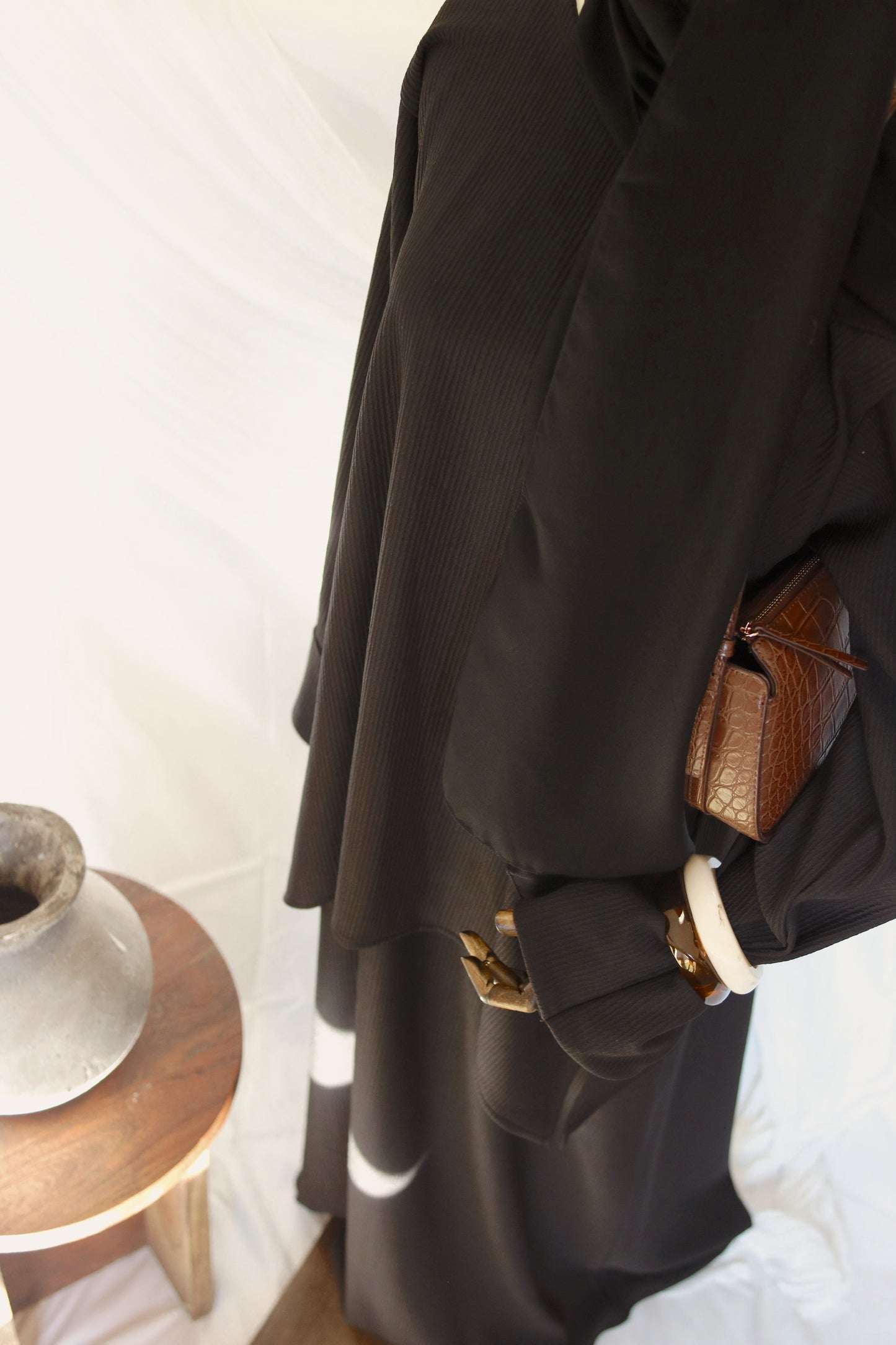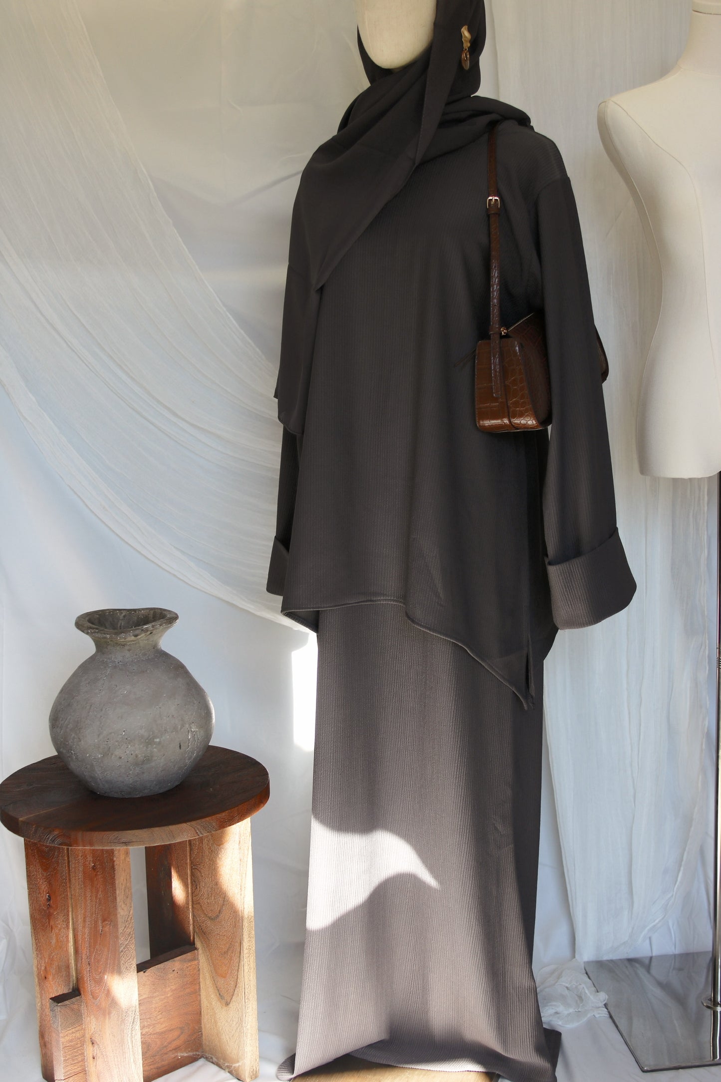 Regular price $45.00A refined two-piece abaya set featuring a flowing inner dress paired with an oversized, sweater-inspired long sleeve top. Designed with a soft ribbed texture, it offers comfort and graceful coverage. Effortless to layer and easy to wear, this piece brings together cozy structure and timeless modest elegance.