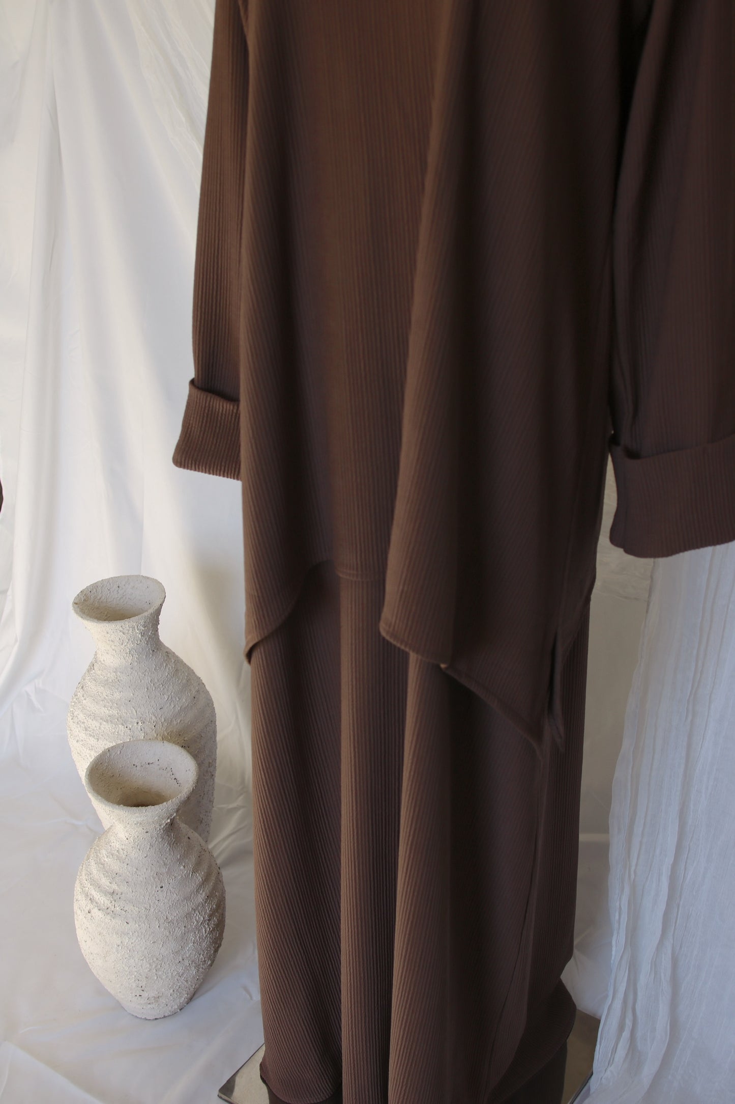 A refined two-piece abaya set featuring a flowing inner dress paired with an oversized, sweater-inspired long sleeve top. Designed with a soft ribbed texture, it offers comfort and graceful coverage. Effortless to layer and easy to wear, this piece brings together cozy structure and timeless modest elegance.